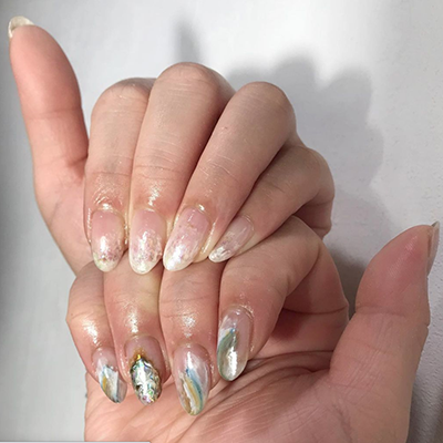 フットジェルで、今回は明るいモスグリーンからグレーブルーにしていただきました。 好みの色もいくつか提示してくださって選びやすかったです。 爪の形も細かく相談に乗っていただけました。